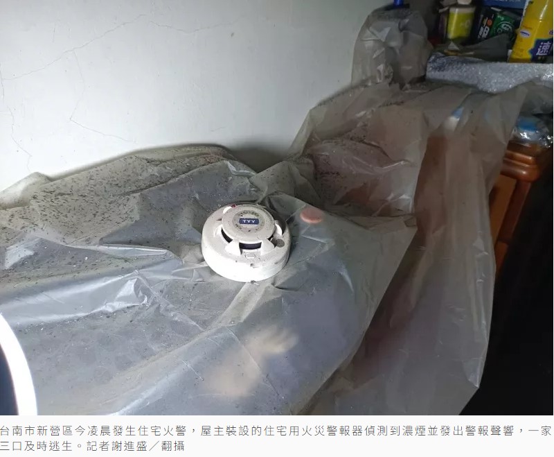 台南市新營區10月16日凌晨發生住宅火警,屋內濃煙竄出,屋主裝設的住宅用火災警報器偵測到濃煙並發出警報聲響,陳姓屋主睡夢中驚醒,叫醒妻子及女兒,均未受傷,火警原因待查。
