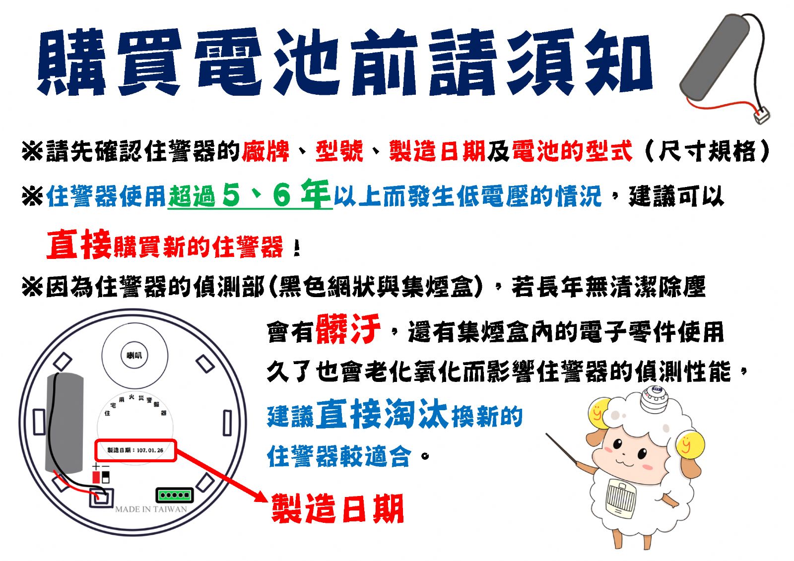 因電池連接器規格問題,下單前請先來電詢問 ⚠️製造日期為109年12月31日前,建議整顆住警器汰換掉購買新的住警器。